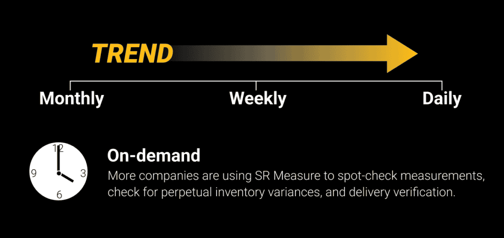 The advancements with our SR Measure app isn’t just changing who can measure – it’s increasing the frequency and why measurements are taken. Our users have moved beyond traditional month-end inventory counts. Our data shows that users are measuring 2-5 times per week to support day-to-day operational decisions.