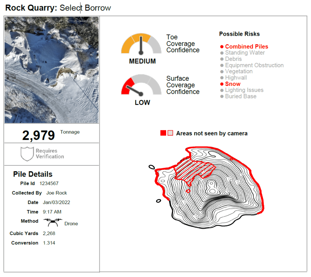 Heavy snow cover on stockpiles, especially fresh or windblown snow, leads to texture-less surfaces, a modeling challenge for any photo-based 3D technology. Stockpiles need unique visual features to be converted into a measurable 3D model. Fresh, white snow is completely devoid of unique features, leading to gaps in the measurement data (we mark these risk areas on stockpiles in red on measurement reports). In some cases, when no texture is captured over an entire stockpile, we are unable to produce a measurement report.