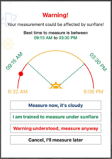 - The sun azimuth is lower during the winter months which has a potential for sun flare in your iPhone measurements. We recommend measuring as close to noon as possible. The iPhone app recommends the best time measure at your specific location.