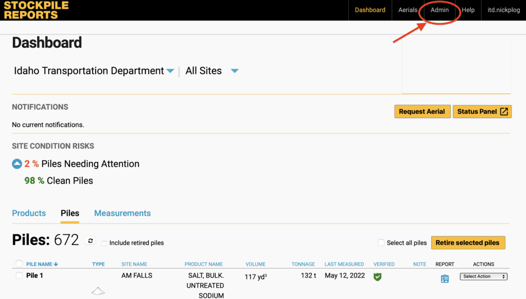 Admin users in Stockpile Reports can manage their organization’s account through a set of tools. These include managing users, sites, products, and bunkers. This article shows you how to access and use the Admin tools.