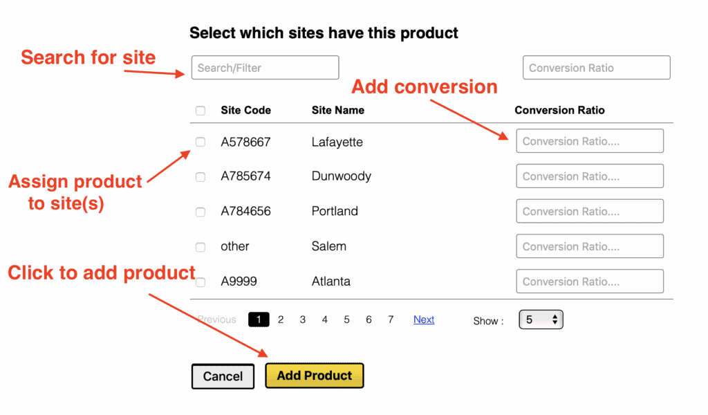Add and assign products to sites, assign conversion rates, and delete existing products.