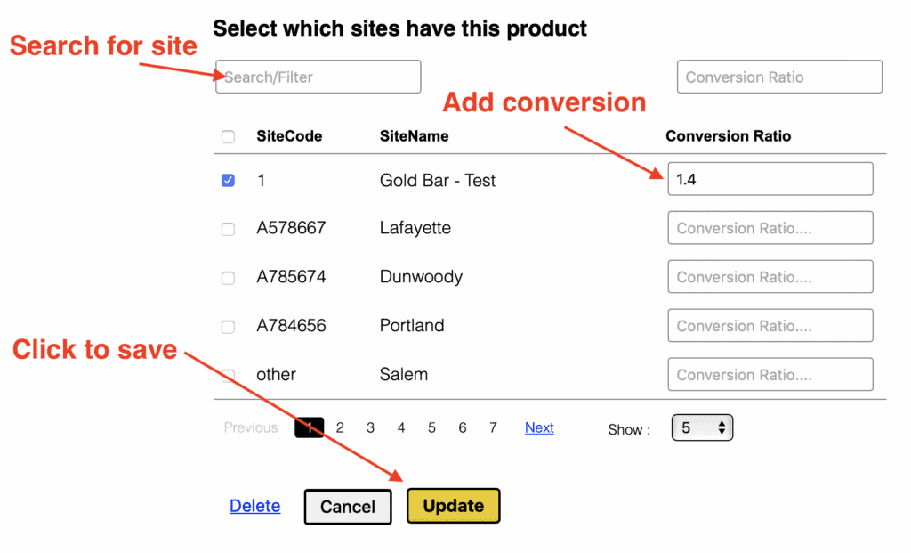 - Select Which Sites Have This Product: Check mark the boxes for each site for which the product is associated. Fill in the associated tons per cubic yard conversion ratio for each selected site
