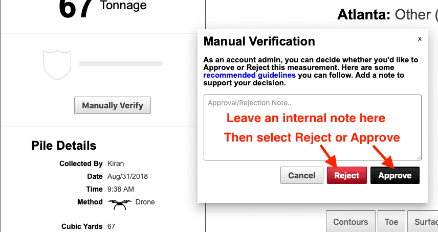 If you are unsure whether to accept or reject a measurement, click the “Request Inquiry” button under Pile Details on the report page. Request assistance in determining if the pile can be manually verified and a Stockpile Reports representative will assist you with the process.