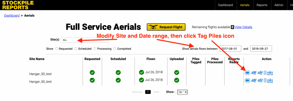 2. Scroll to Full-Service Aerials and click the Tag Piles button next to the site you want to process.