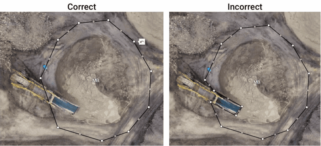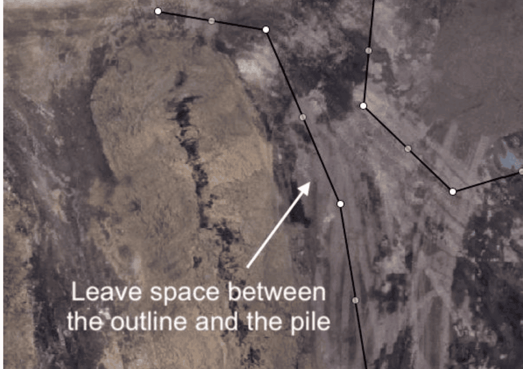 Leave room around each pile on the outlines to include several feet of ground. Outlining piles directly along their toe may cause a section of the pile base to be discarded from the total volume.