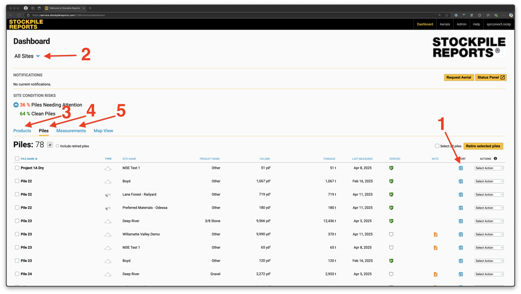 The Stockpile Reports Dashboard will include all measurements regardless of what measurement method was used (SR Measure app or drone, for example).