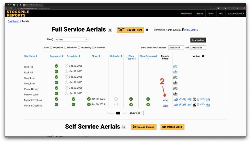 The Aerials Page lists out pending and completed flights for your sites. You can use the “Site(s)” and the Date Range filters to isolate specific flights that you are interested in. This page will only show aerial measurements (it will not include any SR Measure measurements, for example).