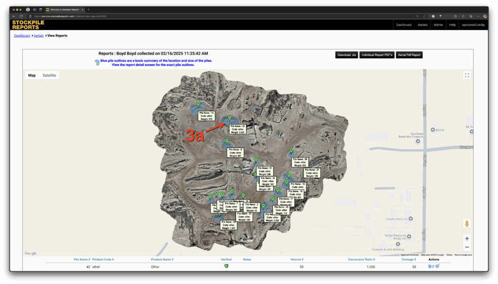 After you’ve completed the process of tagging your piles for measurements, our system will process the 3D data from your flight images and generate the pile measurements.
