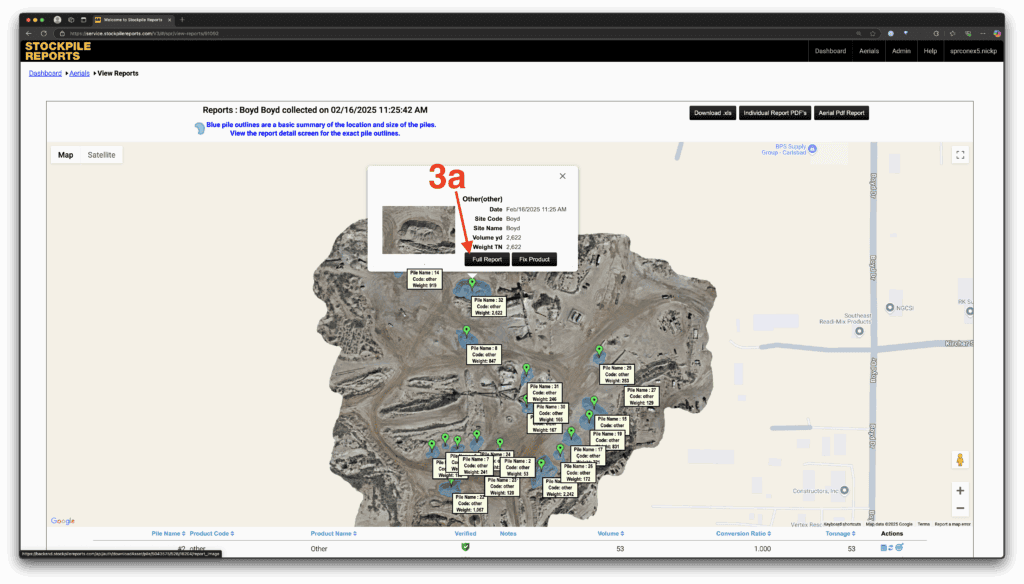 Option 1 – In the top-down aerial view, click on one of the blue-highlighted piles with a green pin. This will give you a quickview of the pile measurement. For more information, click on the “Full Report” button.