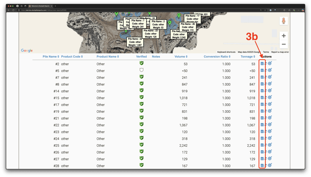 Option 2 – Below the top-down aerial view is a list of all the measured piles. You can click on the blue clipboard icon for the full report of a specific pile.